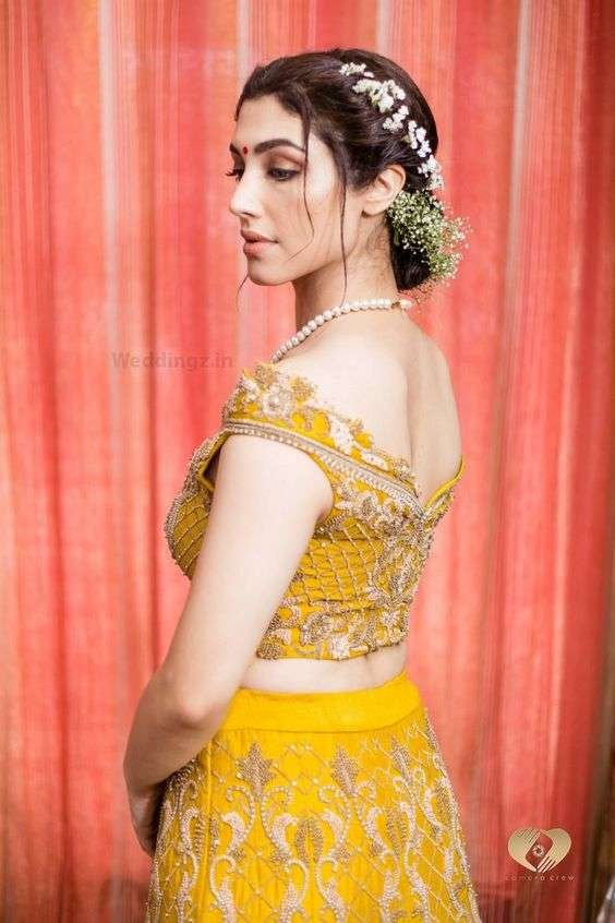 - Traditional Yellow Lehenga Set: Embrace tradition with this elegant lehenga, featuring intricate embroidery and a flowy silhouette. It’s perfect for brides wanting a classic yet striking haldi outfit idea.