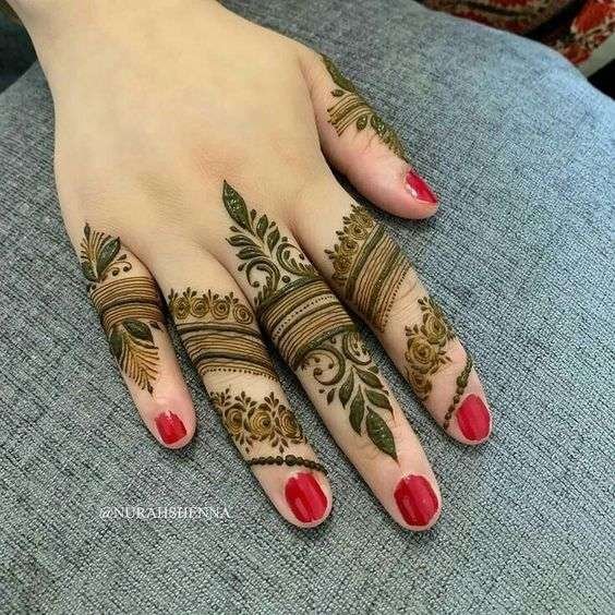 - Full-Hand Mehndi: Pair your finger mehndi design with a complementary full-hand mehndi design. The finger mehndi can serve as a focal point, while the full-hand design provides a backdrop of intricate patterns.