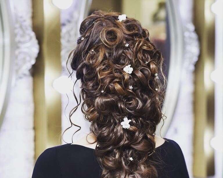 It’s amazing how a simple twist can transform the most basic of french fishtail bridal hairstyles into something incredible. This gorgeous curly hairstyle has been elevated to the next level (figuratively and literally) with some twists and floral accessories.