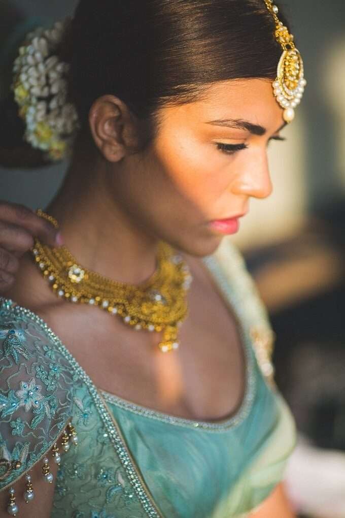 How pretty is the bride’s messy side braid? Just add a simple mathapatti and paranda and turn heads all the way with this bridal hairstyle! It’s a great option for all the brides looking for bridal hairstyles for curly hair too!