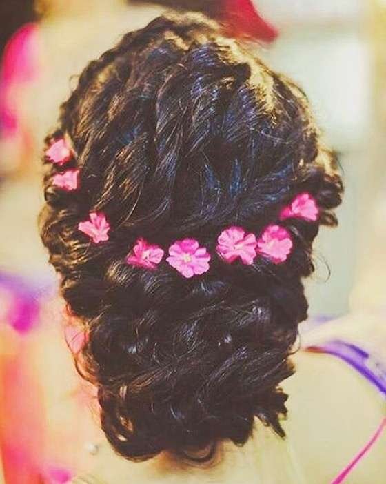 Go the super soft and romantic way on your wedding day with this cute bun hairstyle. This curly French twisted bun looks oh-so-sweet and adorable, thanks to the delicate flowers lining it at the top.