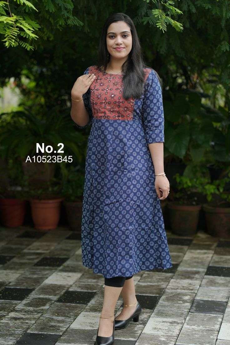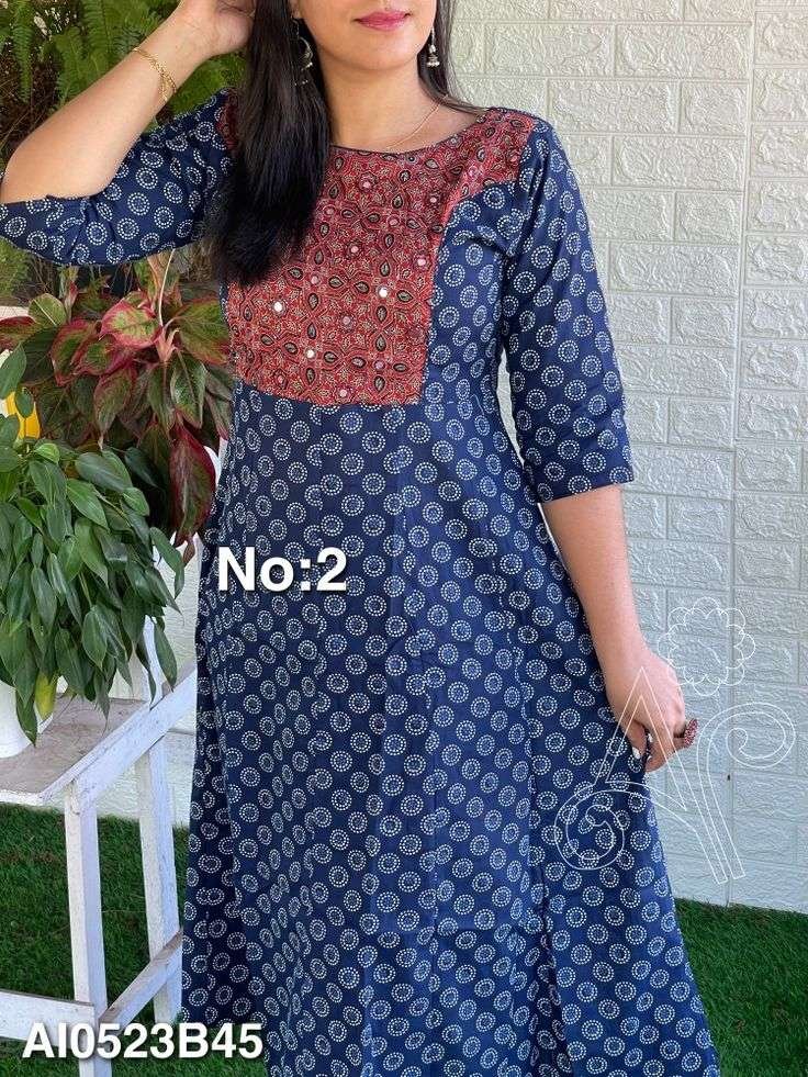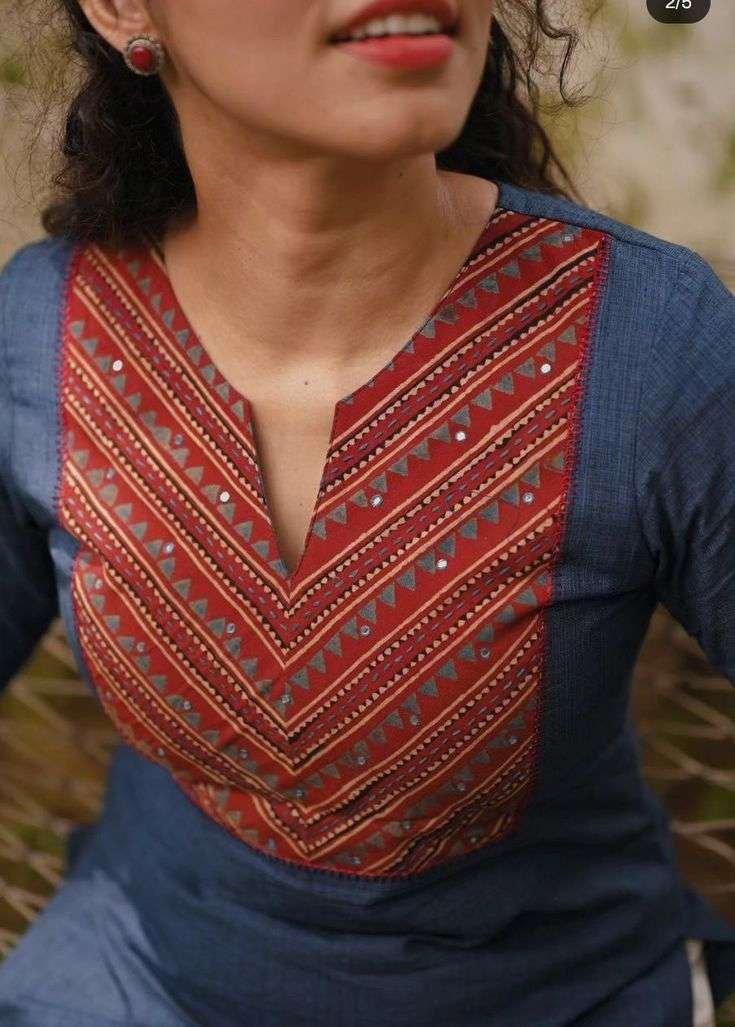 For a modern twist, explore Ajrakh prints on contemporary silhouettes like dresses or tunics. These pieces are perfect for casual outings or office wear with their effortless charm. - Ajrakh Kurthys with Colorful Prints