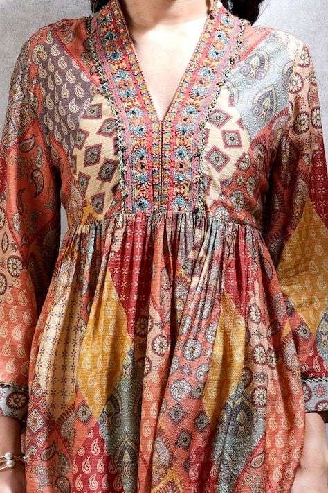- Features and Styling Tips: The V-neck design enhances the collarbones and draws attention to the face. It creates an illusion of length and is particularly suitable for individuals with shorter necks. To style a V-neck kurti, you can pair it with a pendant necklace or opt for layered necklaces to add depth to the neckline.