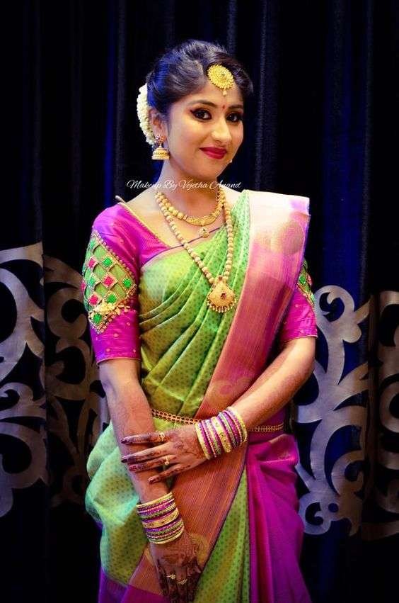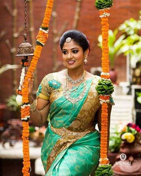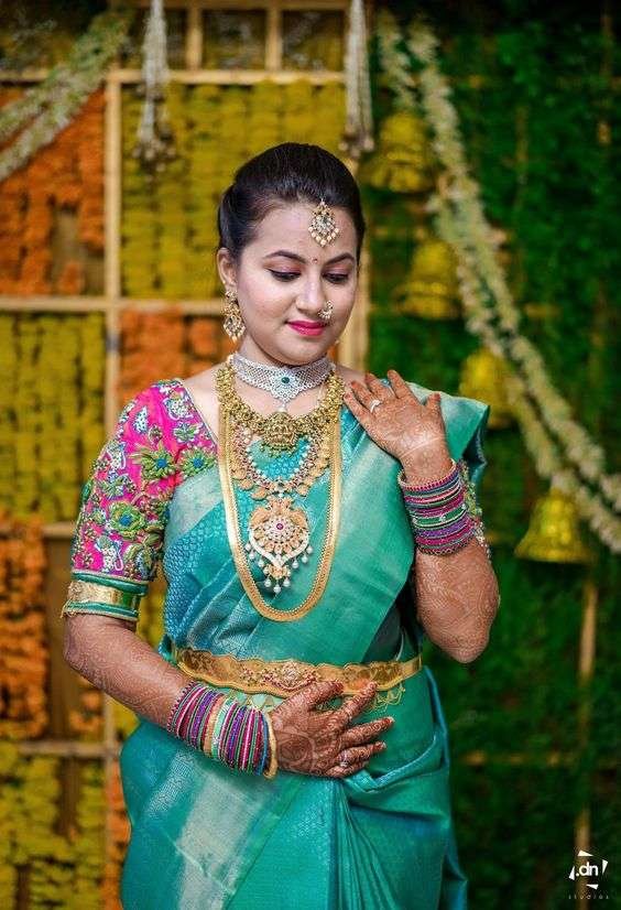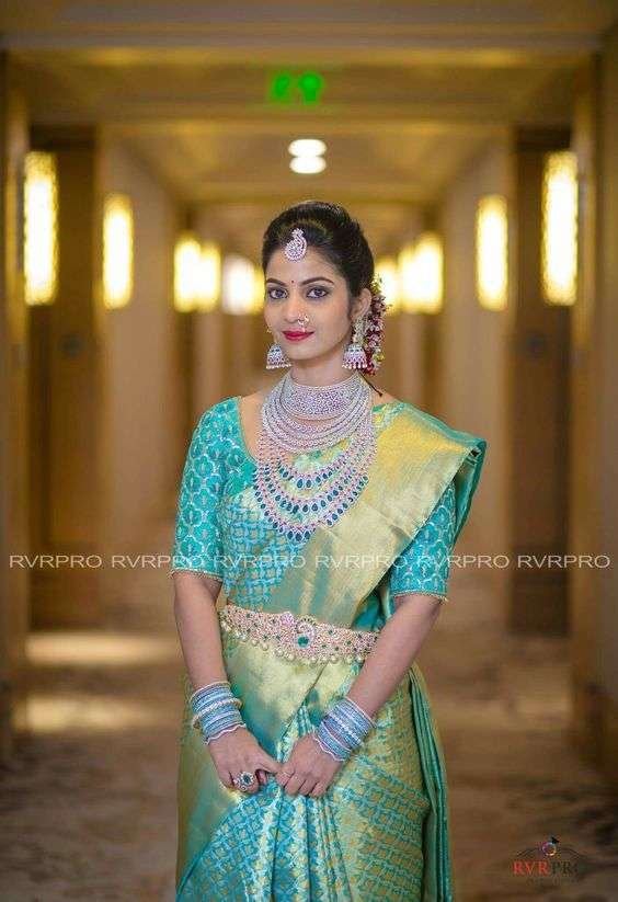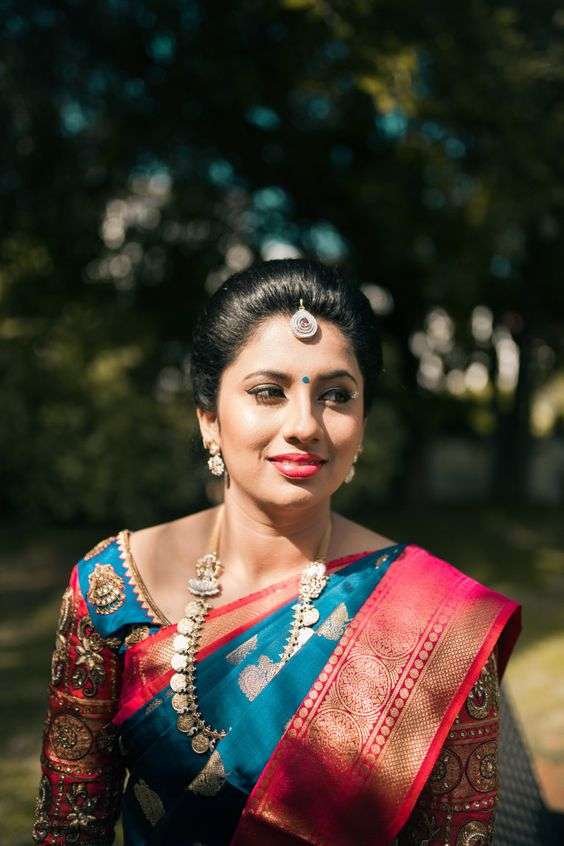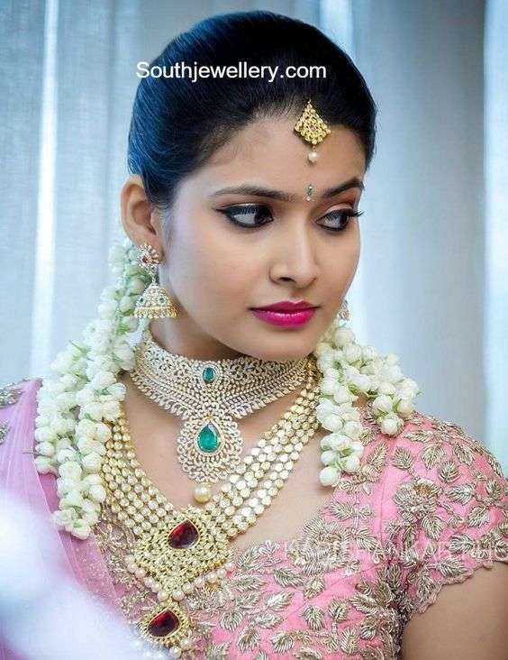 Netisuti is a part of an Indian Bride’s costume. An Ornament attached in the hairline of a woman. Traditionally, an Indian woman wore a Netisuti for the first time on her wedding day. Women’s of all ages wore this on special occasions. It suits both traditional and modern hairstyles. Bride with a beautiful netisuti enchanter groom with her classy look. Netisuti rests in our forehead where there is the power of the soul that is the sixth chakra. The place where it rests will stimulate the power of concentration and controls one’s emotions. Today women not only in India but across the world wear the Netisuti as a fashion statement, with traditional Indian attire and sometimes even with western wear. Choosing the right jewelry piece according to one’s personality is also very important. While selecting a new suit, one should choose it according to the size of one’s forehead. A lady with a broader forehead will look good in a heavier netisuti and a light delicate one will suit more on a woman with a smaller forehead.