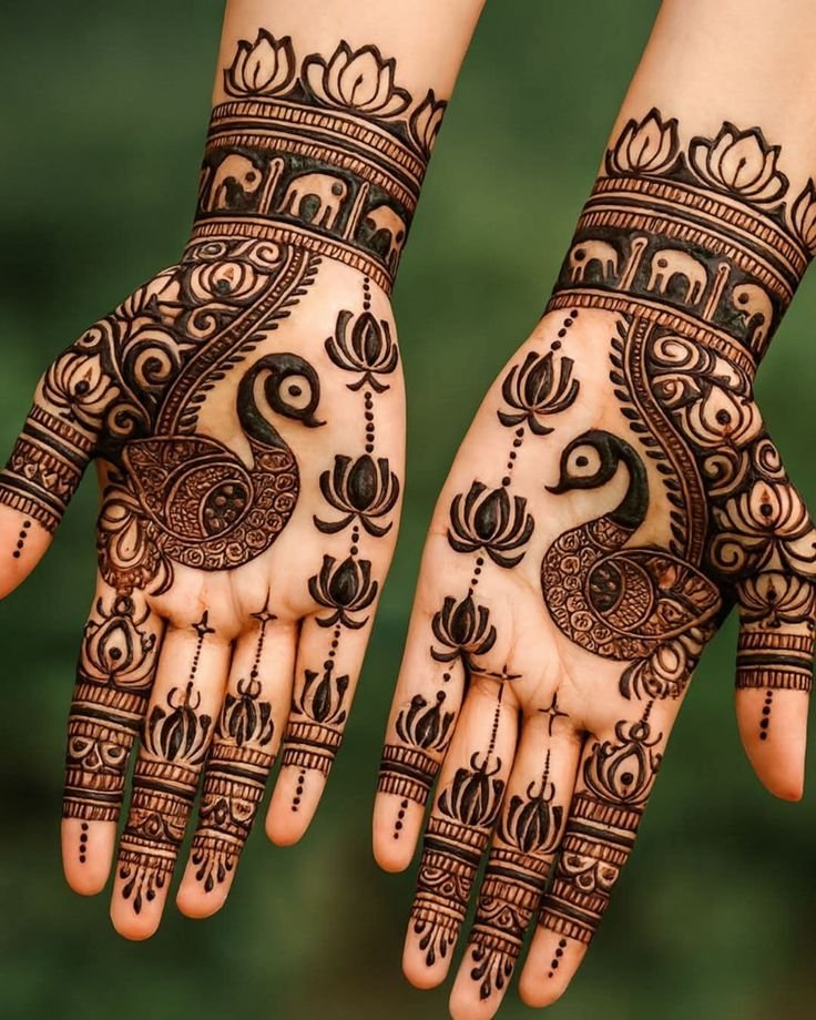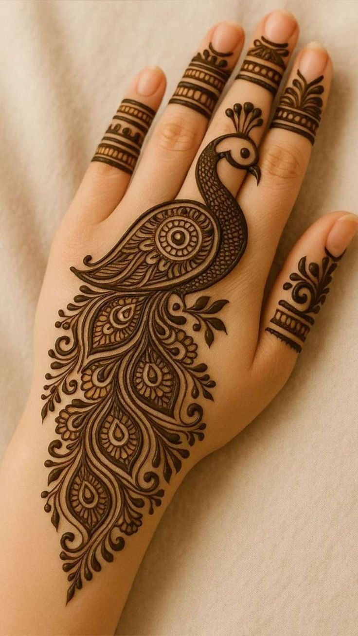 Peacock mehndi designs capture the true essence of grace and tradition with their intricate patterns and royal charm. The beautifully detailed feathers and artistic curves of the peacock make these designs perfect for weddings, festive occasions, and cultural celebrations. They symbolize beauty, love, and prosperity — adding a touch of regal elegance to your hands and feet.