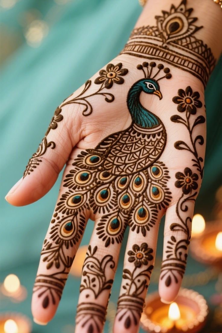 Whether you choose a bold full-hand design or a minimal peacock motif, these mehndi patterns never fail to stand out. The delicate mix of floral elements, paisleys, and traditional motifs enhances the overall appeal, making it a favorite among brides and mehndi lovers alike. Peacock mehndi designs perfectly blend heritage with artistry, creating a timeless look for every special moment.