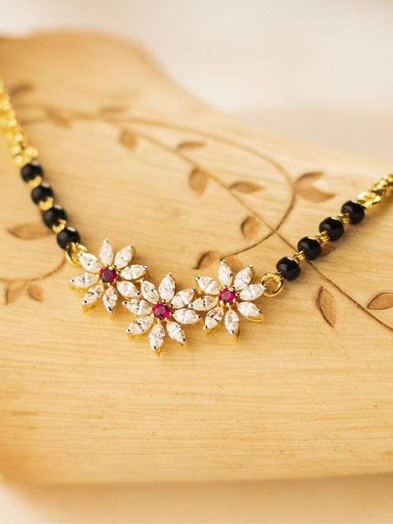 - Floral Charm Mangalsutra Design: Featuring delicate floral motifs, this piece offers a simple mangalsutra design that brings a touch of nature-inspired elegance to your ensemble.