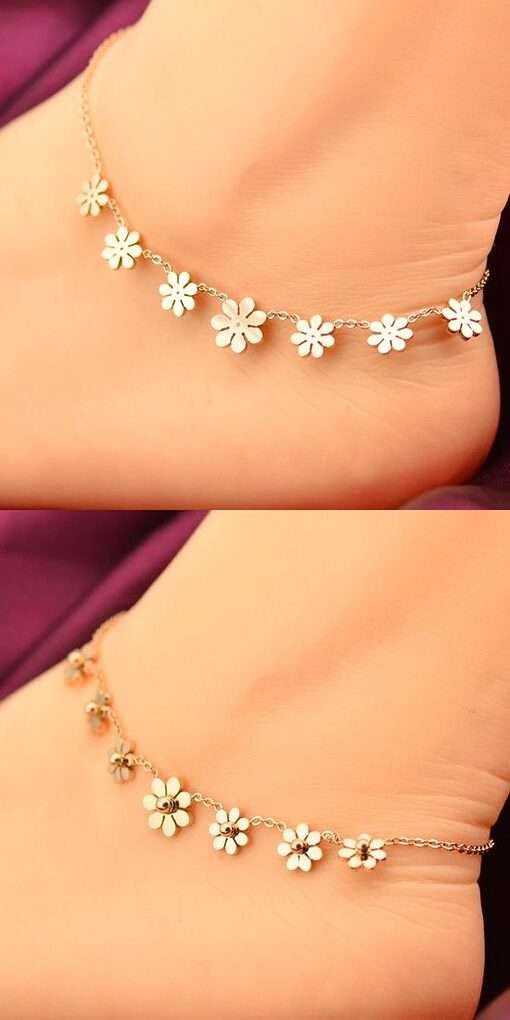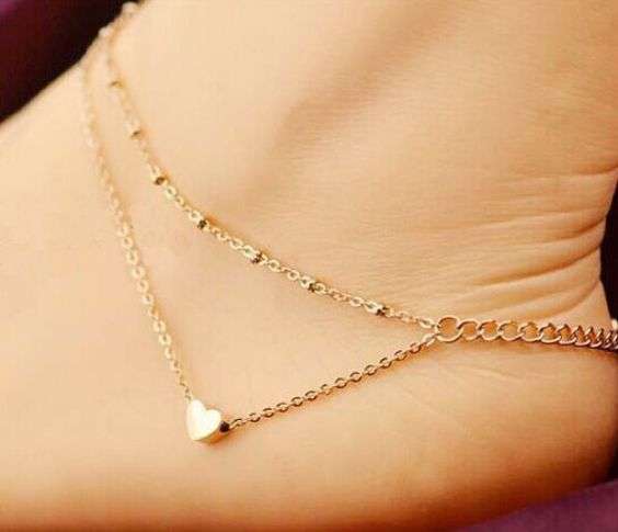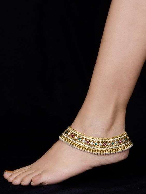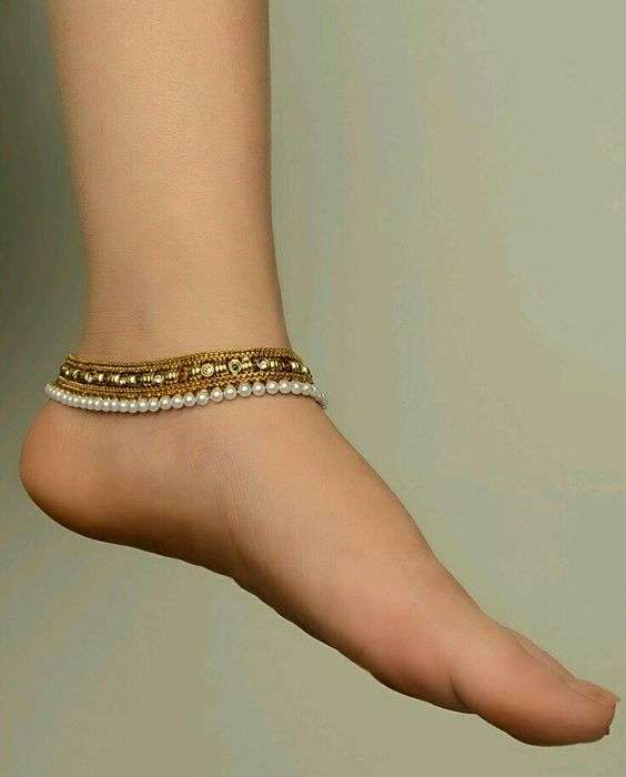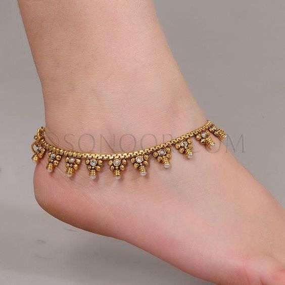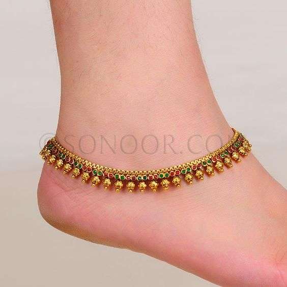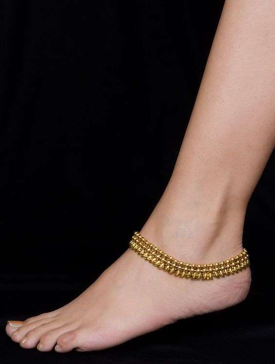 Jewellery Gold anklets and leg chains By Neethu Krishnaraj Published On: October 18, 2023 The pretty bridal anklet is designed with traditional chain design with scalp chain hangings and ball hangings merge well and make the bride leg gorgeous and goes well