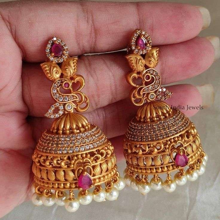 Temple jhumkis are versatile enough to complement festive occasions and modern styles, making them go-to pieces of traditional jewelry. Crafted in gold tones, these earrings blend regal charm with everyday usability. Adorned with pearls, beads, or kundans, they exude unmatched grace.