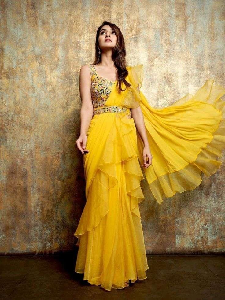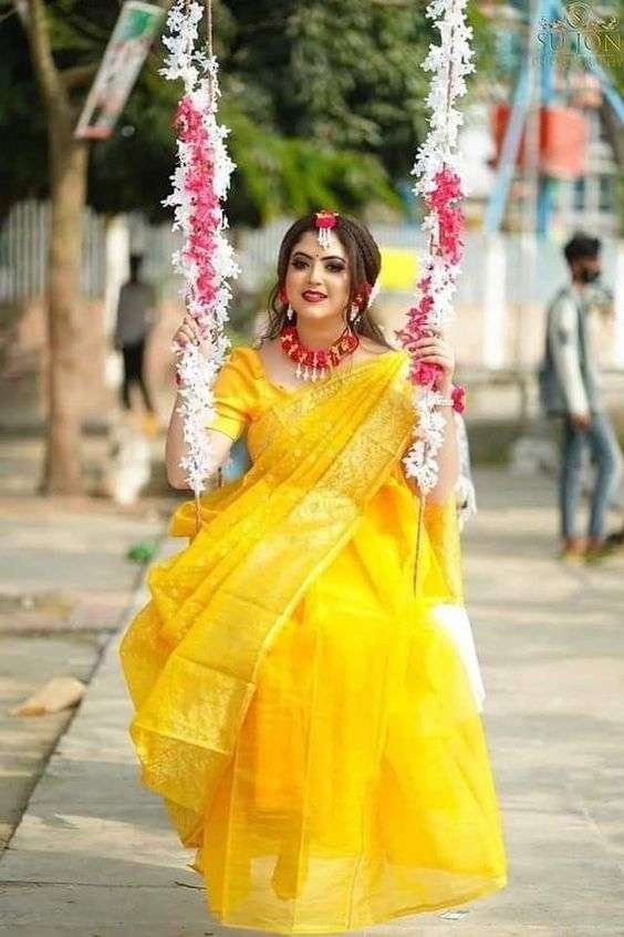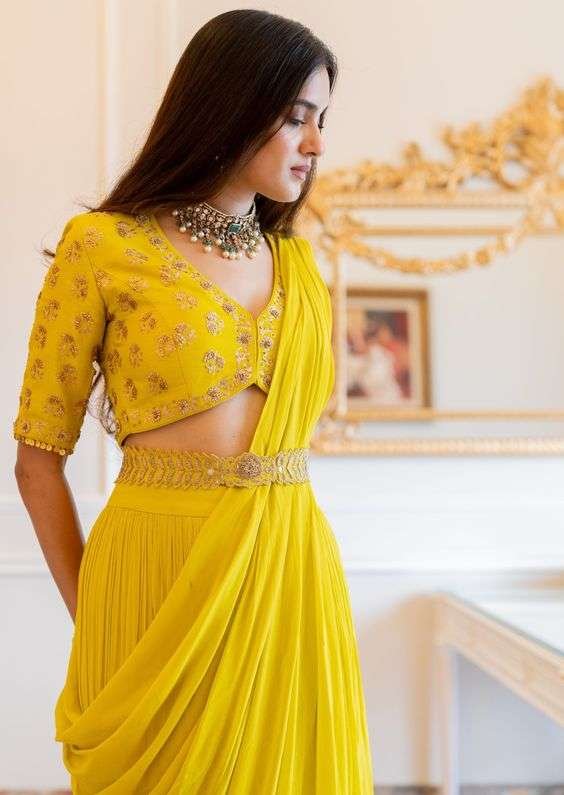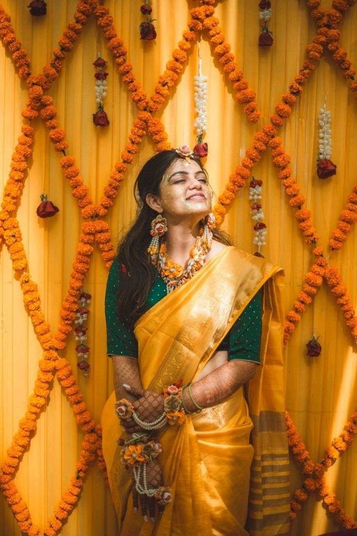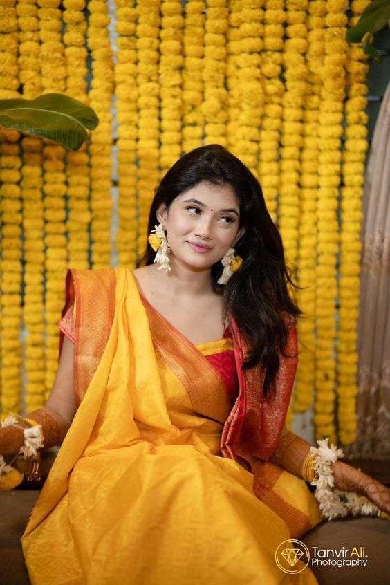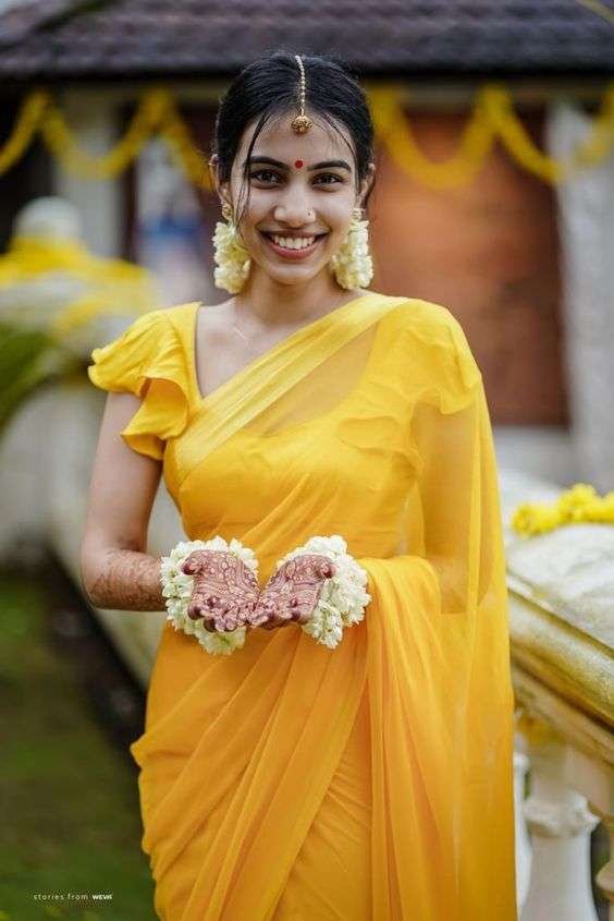 - Traditional Saree with Modern Twist: Perfect for brides who love fusing old with new, this saree features modern draping styles, offering fresh haldi clothes options.