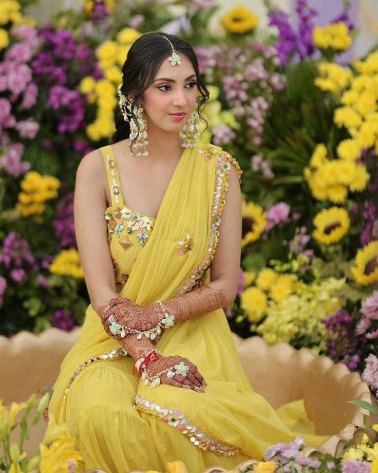 - Chic Yellow Shararas with Dupatta: For a contemporary twist, these shararas are both stylish and comfortable, making them a standout haldi ceremony dress for bride.