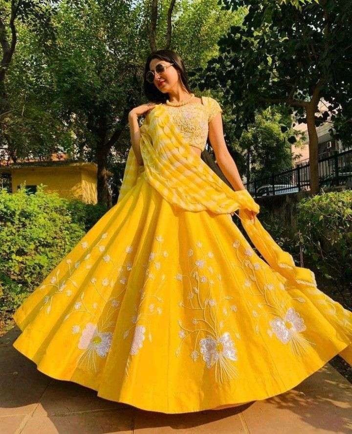 - Simple Lehenga with Intricate Border: A minimalist choice, this lehenga features an elegant border, embodying the best of haldi dress simple while maintaining traditional beauty.