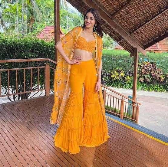 - Stylish Palazzo Set with Embroidery: This palazzo set combines trendy with traditional, ideal for those exploring haldi dress ideas for bride that prioritize comfort and style.