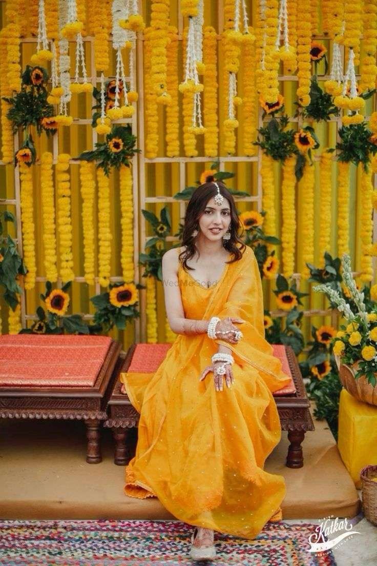 - Bright Yellow Anarkali Gown: This vibrant Anarkali gown offers a flowy silhouette perfect for a haldi function dress, ensuring elegance and comfort for the bride.