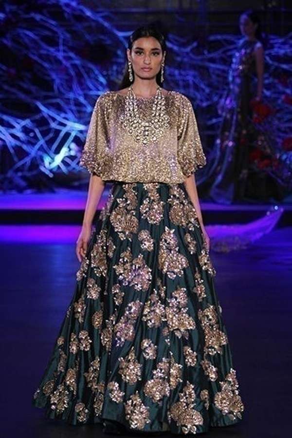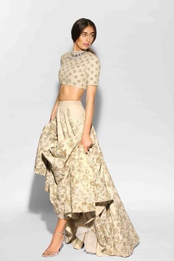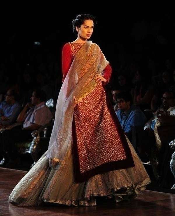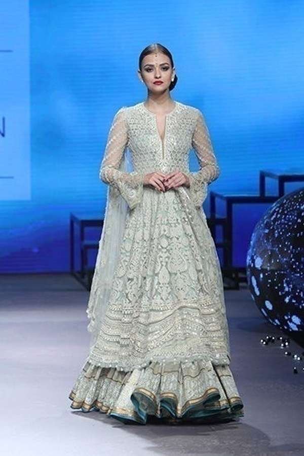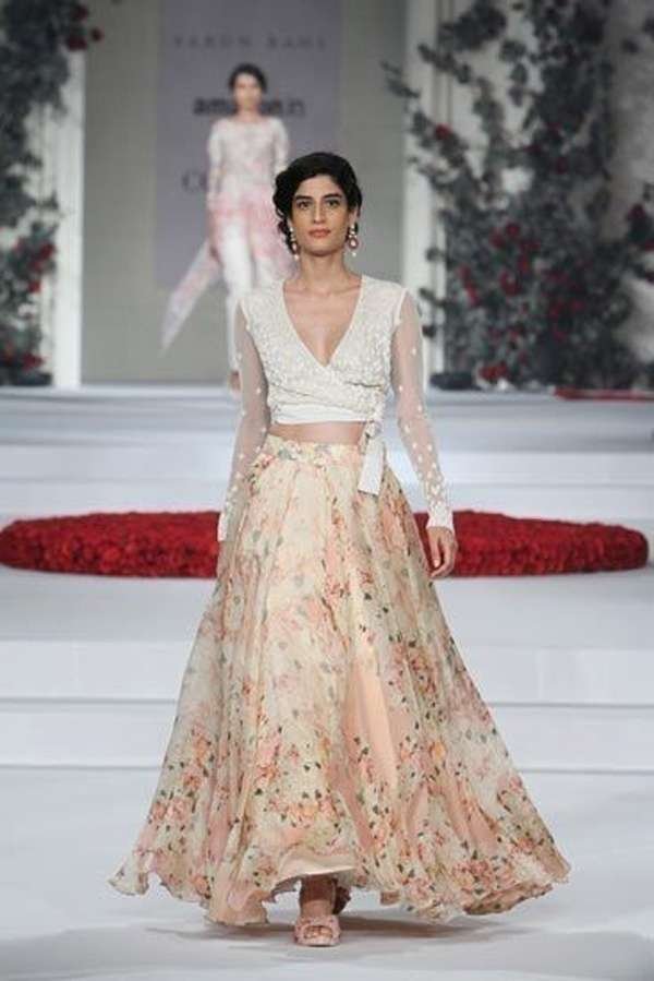 The inspiration for lehengas with trails has its roots in Christian wedding dresses. The flare and silhouette of the entire outfit lends an extremely empress-like feel and exudes a vibe of all things grand and royal.