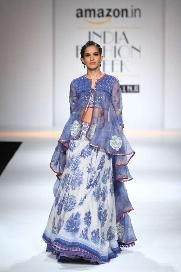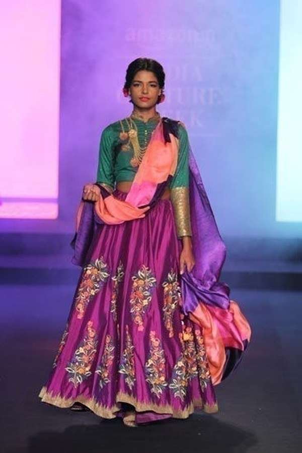 Solid colours coupled with prints serve as perfect canvases to mould a layered lehenga or one paired with a jacket. With multiple layers, it gives designers a chance to use different fabrics and also play around with ombre tones, lace and even use contrasting colours.