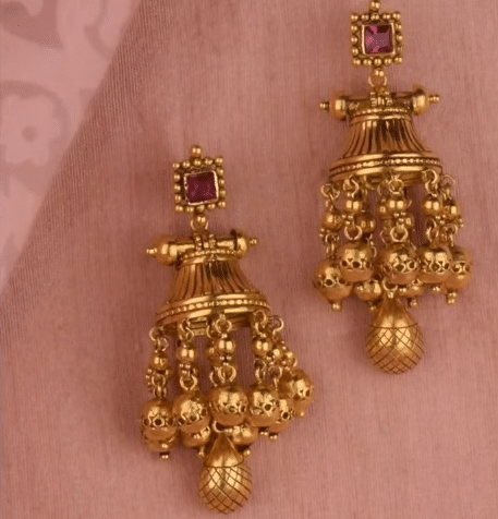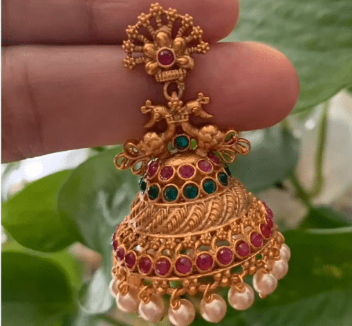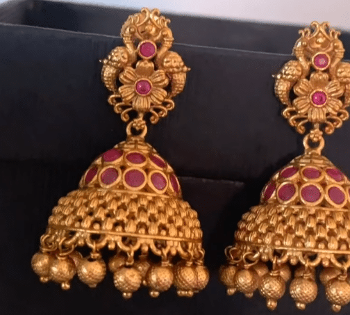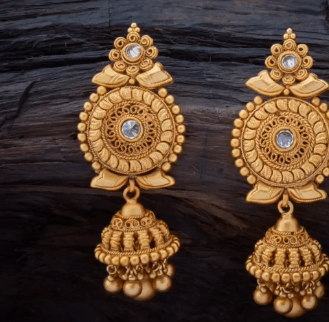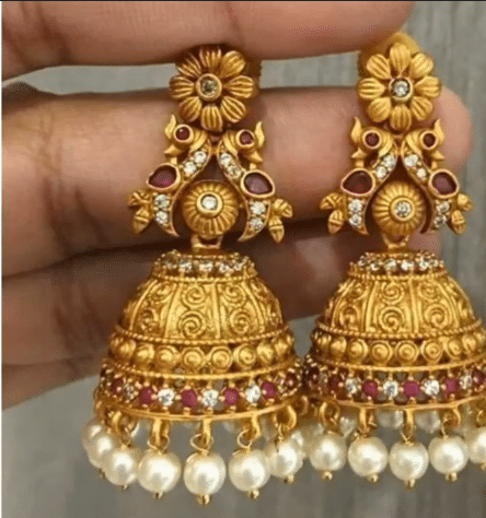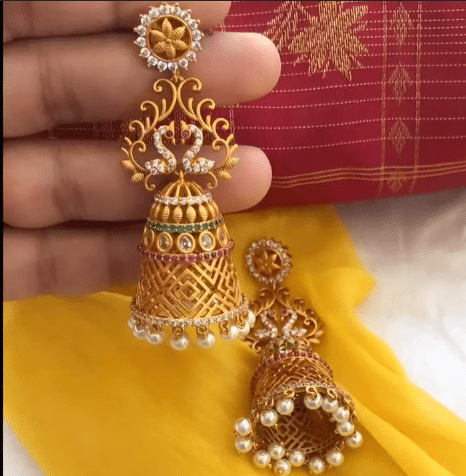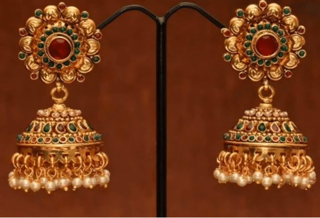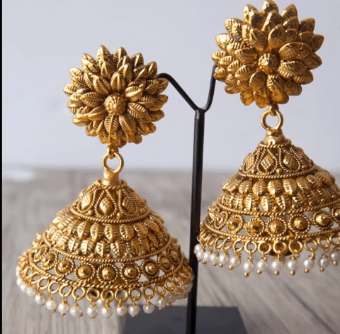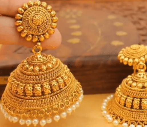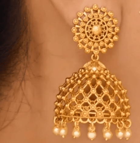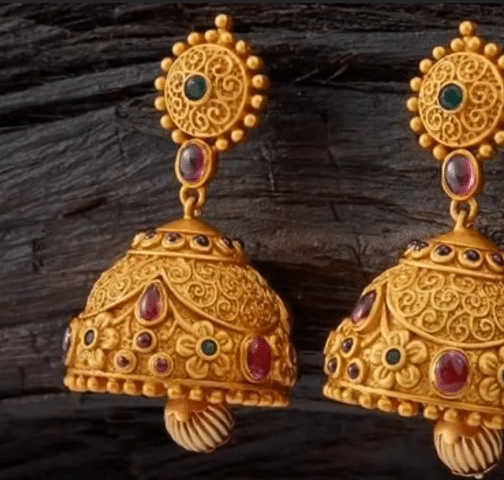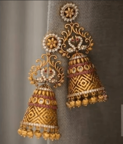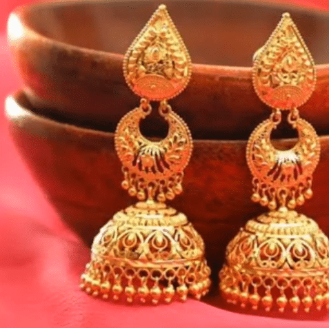 - Gold Jhumkas: Gold jhumkas exude opulence and grandeur. Crafted in 22-karat gold, these earrings are often adorned with precious gemstones like diamonds, rubies, emeralds, and pearls. Gold jhumkas are highly sought after for weddings and special occasions, symbolizing wealth and prosperity.