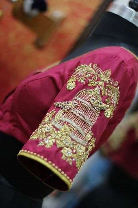 53. Intricate blouse border maggam work with golden zari