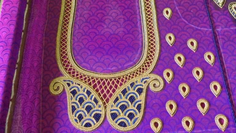 Maggam works are now the in-thing in the world of a fashion as they give an amazing look to any garment. This is one of the most popular types of embroidery also called aari embroidery Maggam work can be done in saree’s, Lehnga ’s, choli, half-saree or on any dress material which you like. Maggam work can be done with threads, beads, special stones, jardosis. Maggam work artist says that it will take eight hours for completing simple maggam work and two to three days for complicated work. For putting maggam we need thread, frame, needle, and scissors. Artist will trace the design on the material which he wants to put then he will start the work.