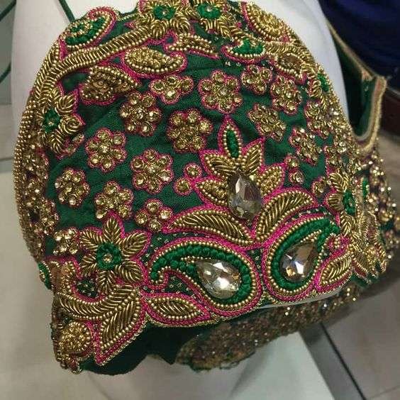 21. Pink, Green zari with golden jardosi and stone blouse design
