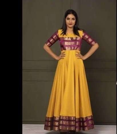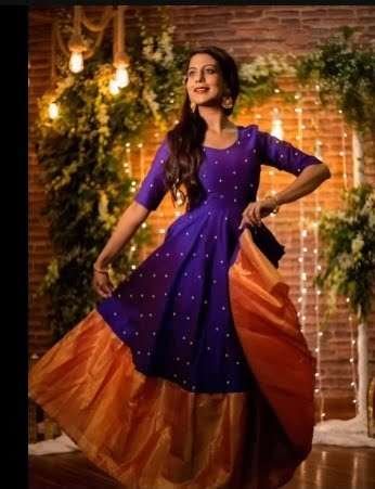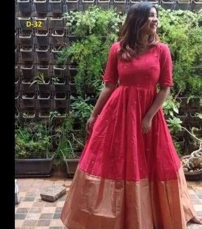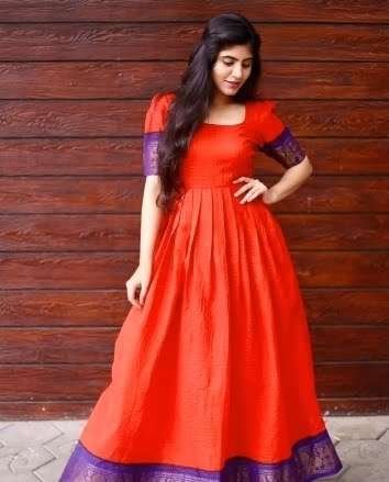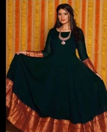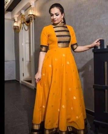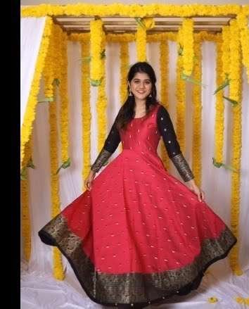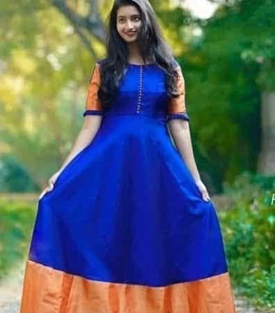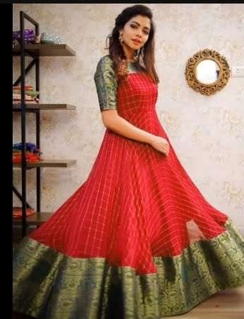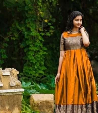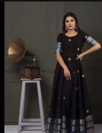 This new long frock is a designer piece. It has a net sleeve with a decorative neck pattern. The neck has a slant floral design.