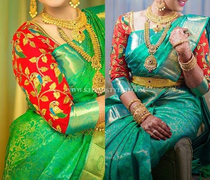 You can get innovative with this, and make your blouse a truly captivating one. Take advantage of long zari and flaunt it as your blouse sleeve. If needed, go for catchy embellishment (like stonework or Kundan work) to balance the blouse with saree.