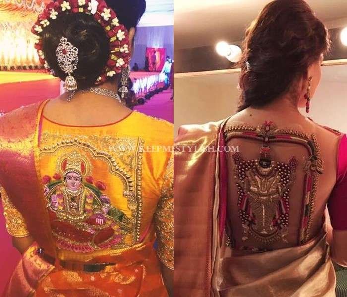 Blouse back side offers lots of scopes to make your entire saree style unique and effective. One particular trend that has caught our attention is the bold intricate detailing of god and goddess image with colorful thread work.