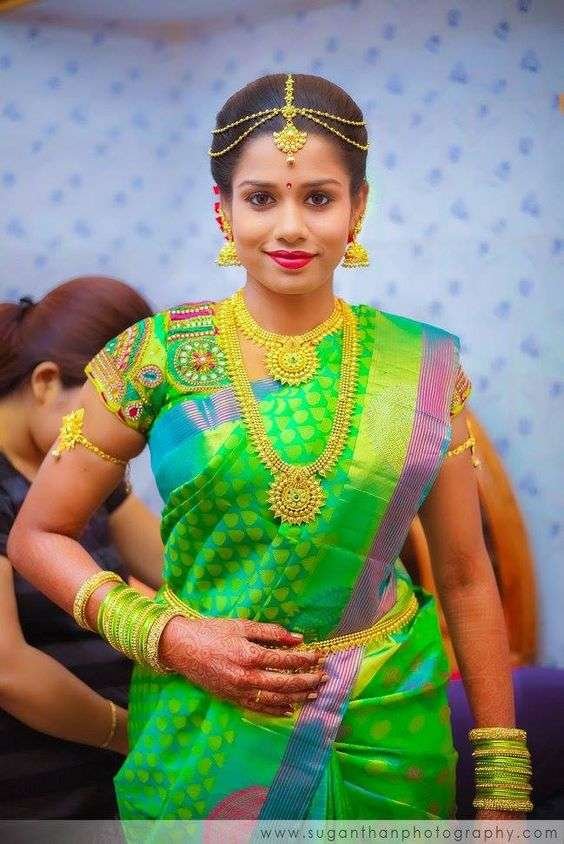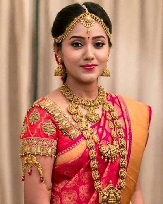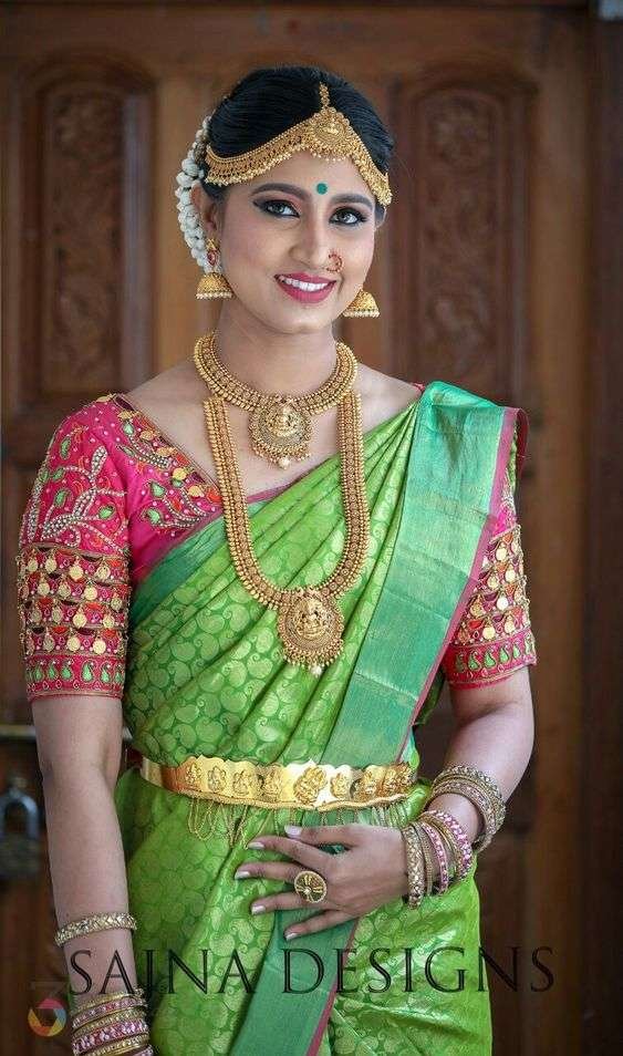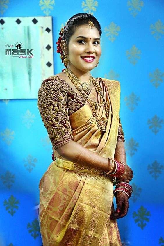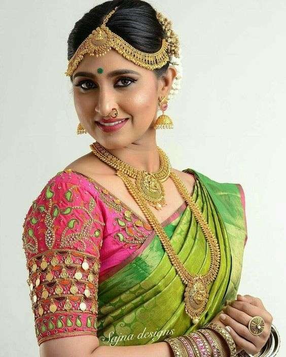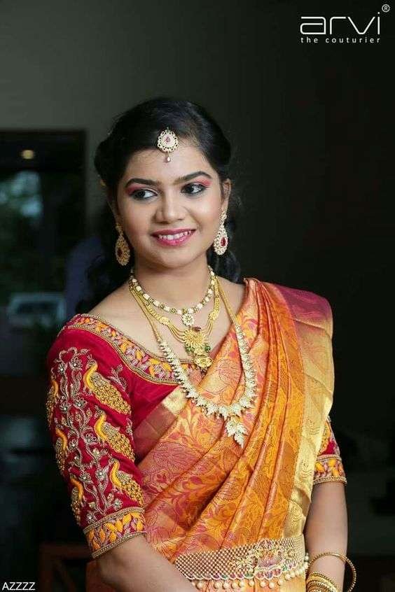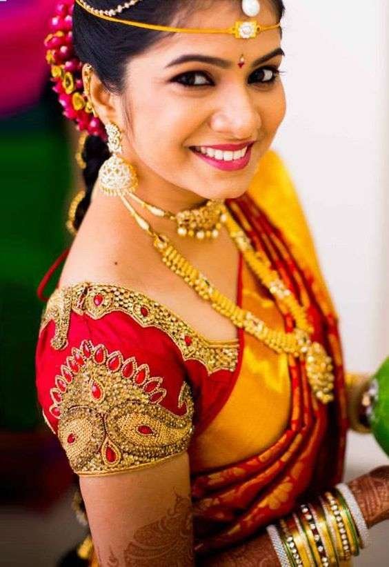 South Indian wedding sarees are usually a combination of red and yellow or a mix of shades that fall under either of them. … traditional silk saree blouse design.