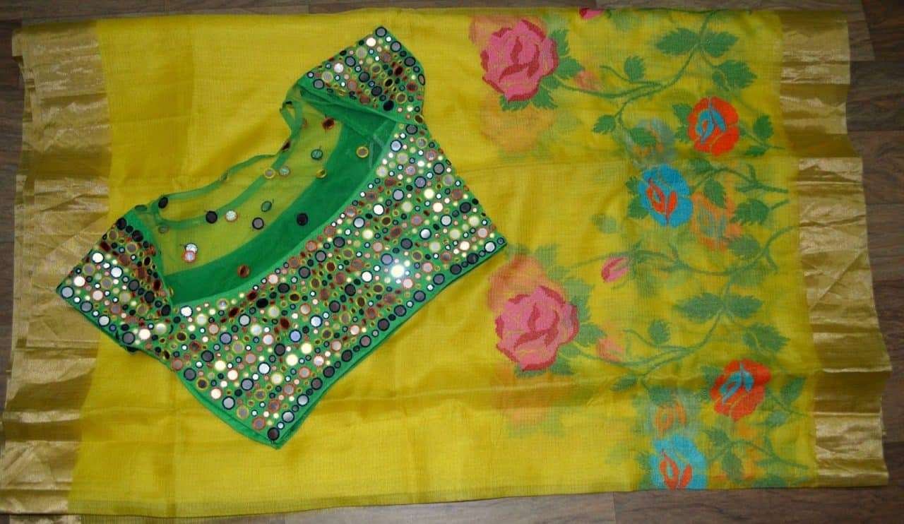 Designer Blouse For Party Wear Sarees. … From lehengas to sarees, salwar, and blouses they have taken over. So instead of just a contrast blouse for the plain saree, go with this raw silk floral blouse with a boat neck. Wear a pair of earrings and nothing else to elevate the blouse.